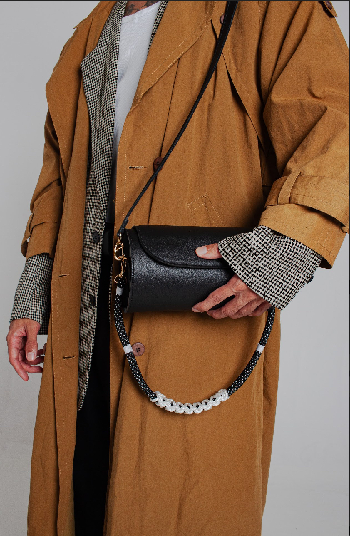 Alça de mão removível feita em corda de garrafa pet, com detalhes em macramê